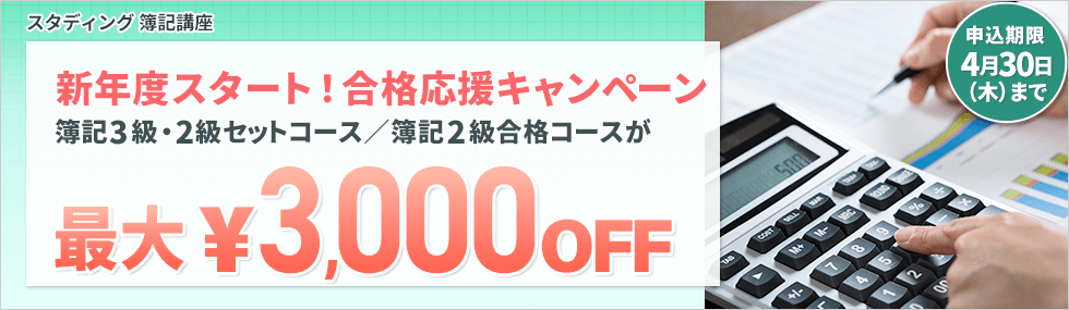 | 簿記3級合格コース [2025年12月~2026年9月合格目標] 一括 3,850円 受講期限:2026年9月末まで基礎から学び3級合格を目指すコース まずは3級だけ集中して学習したい方におすすめ 詳細はこちら