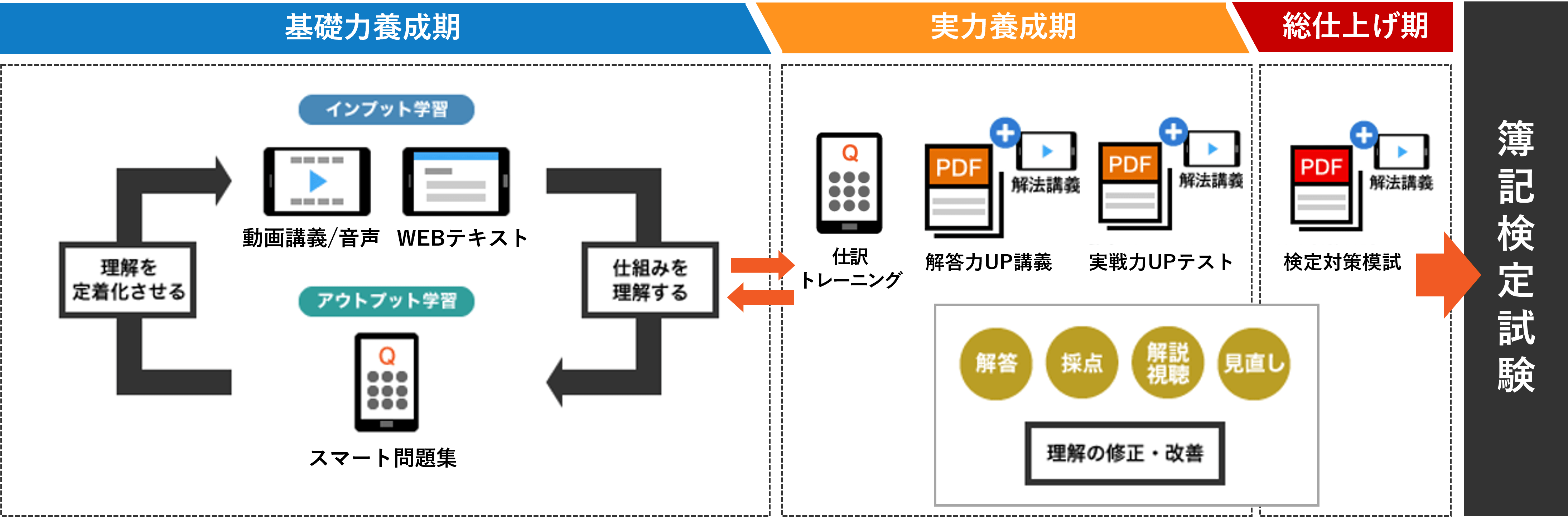 短期合格するためには、インプット学習はテンポよく先へ進み、十分なアウトプット練習量を確保することが重要です。 「動画講義」「スマート問題集」で基礎力アップ。 着実にステップアップできる難易度設計で合格を目指すあなたをフォローします。