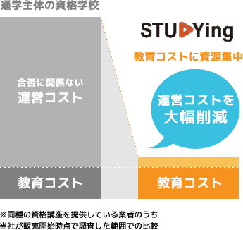 駅前の教室運営費や営業人件費など、「受講生の合格に関係ない事にかかるコスト」を徹底的にカットすることで、従来の大手資格学校の通信・通学コースより低価格※を実現しました。(※同種の資格講座を提供している業者のうち、当社が販売開始時点で調査した範囲での比較)一方、カリキュラムの組み立て、教材・映像授業の制作に全力を注ぎ、コンパクトだからこそ効率よく、合格レベルの力をつけられる通信講座を目指しています。