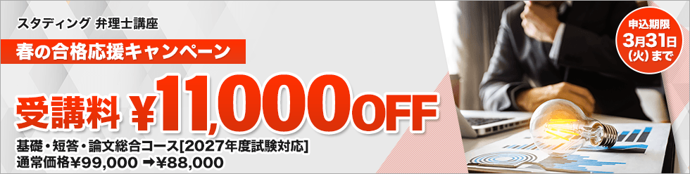 | キャンペーンの特典 | 特典 受講料 11,000円 OFF ・基礎・短答・論文総合コース 通常価格 ⇒特別価格88,000円 |
