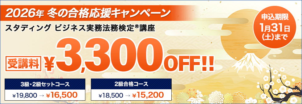 | キャンペーン特典 | 特典 受講料 ¥3,300 OFF ビジネス実務法務検定試験® 3級・2級セットコース[2026年試験対応] ¥ ビジネス実務法務検定試験® 2級合格コース[2026年試験対応] |