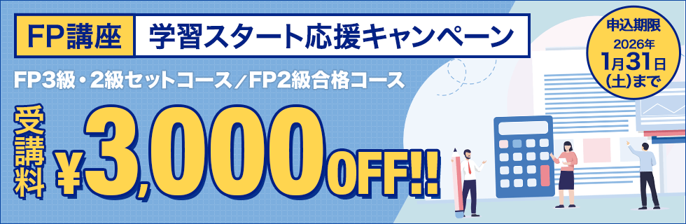 当キャンペーンでは、これからFP試験合格を目指して学習を始める方のために、対象コースを3,000円OFFでご受講いただけるキャンペーンを実施中です。