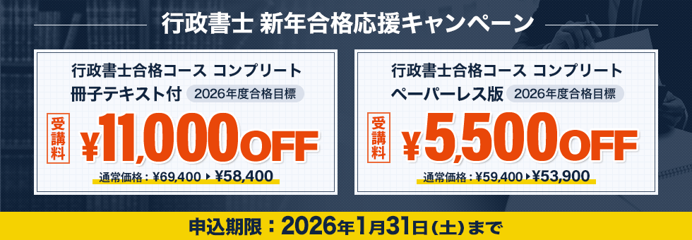 下記からキャンペーンを利用してお申込みできます。講座購入ページにて「行政書士合格コース コンプリート[2026年度合格目標]」を キャンペーン期間中にご購入頂いた方に、当キャンペーンが適用されます。