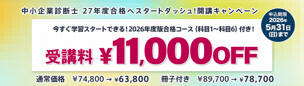新たに2027年度の中小企業診断士合格に向けて学習をスタートする方を応援する気持ちを込めて、お得なキャンペーンを実施しています。