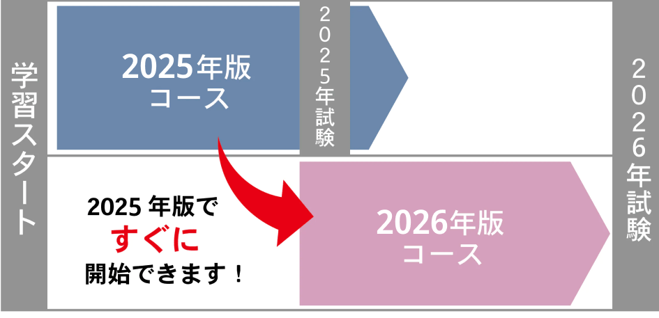 本コースでお申込みされた場合は、2025年度版講座に加えて、今後リリースされる2026年度版講座(2025年11月~2026年6月に順次リリース予定)も受講することができます。2025年度試験に向けて速習したい方はもちろん、2025年度と2026年度試験を両にらみで合格を目指したい方にもおすすめです。