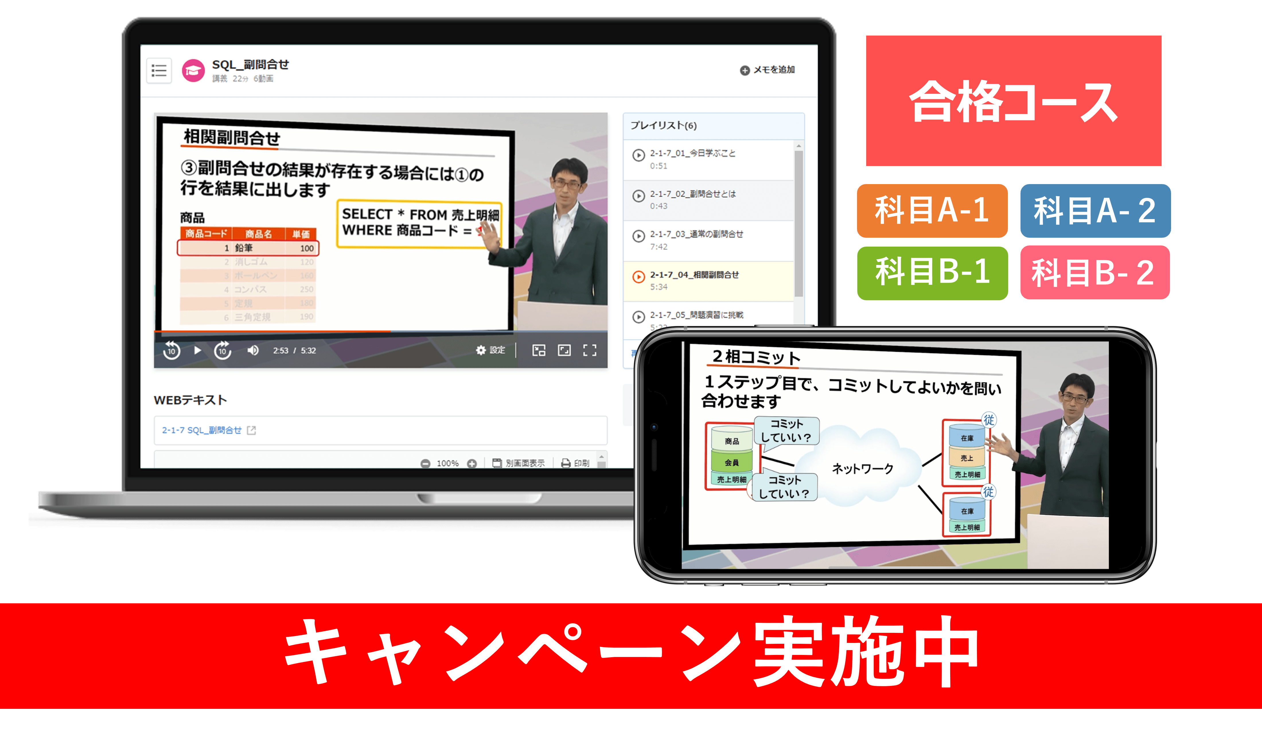 ![]() | 「科目A-1試験免除コース」 科目A-1試験免除者や学習経験者を対象にした受講料が大変お得なコースです。科目A-2試験から科目B-2試験対策講座を効率良く学習することができます。 「合格コース」 科目A-1から科目B-2試験向けの対策まで、合格に必要な対策講座が全て含まれるため、データベーススペシャリスト試験に初挑戦の方へおすすめのコースです。IT分野の基礎知識(ITパスポート合格レベル等)があり、短期合格を目指したい方におすすめです。 |
