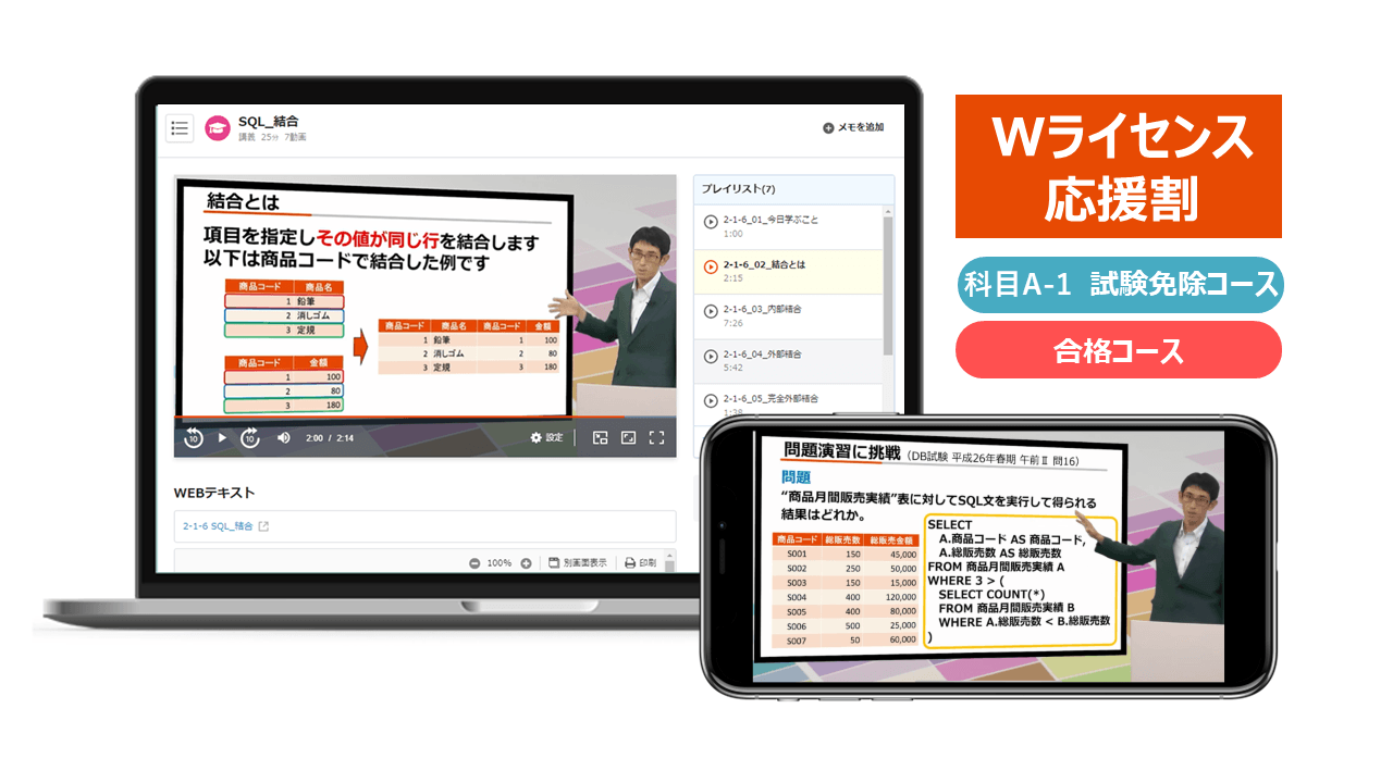 ![]() | 「科目A-1試験免除コース」 科目A-1試験免除者や学習経験者を対象にした受講料が大変お得なコースです。科目A-2試験から科目B-2試験対策講座を効率良く学習することができます。 「合格コース」 科目A-1から科目B-2試験向けの対策まで、合格に必要な対策講座が全て含まれるため、データベーススペシャリスト試験に初挑戦の方へおすすめのコースです。IT分野の基礎知識(ITパスポート合格レベル等)があり、短期合格を目指したい方におすすめです。 |