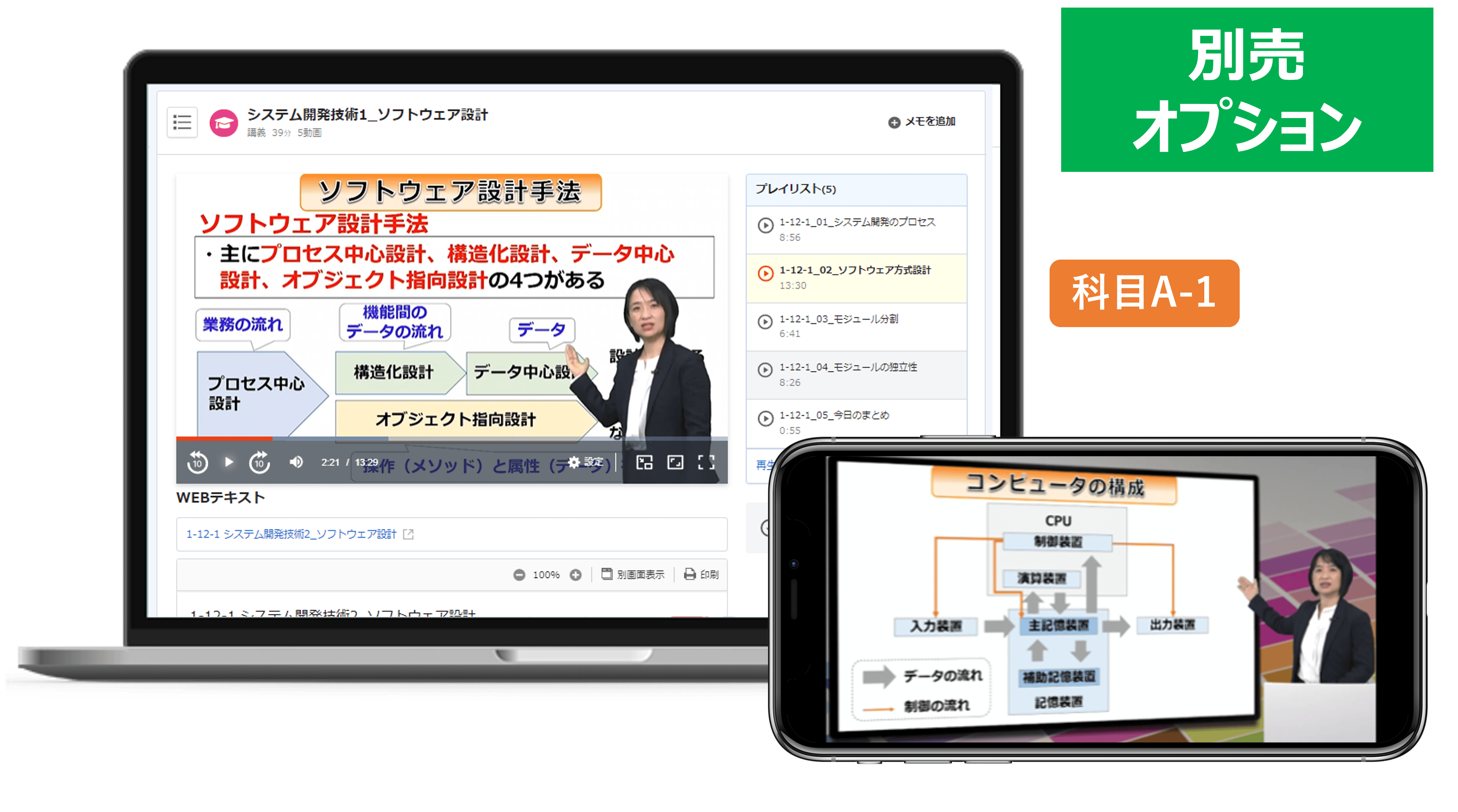 「データベーススペシャリスト 科目A-1試験免除コース」をご受講の方で、科目A-1試験に出題される知識を改めて復習したい方に向けた別売オプション商品です。本コースには、科目A-1試験対策のビデオ講座、WEBテキスト、スマート問題集、セレクト過去問集が含まれます。