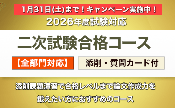 私の指導経験を元に、二次試験対策の正しい方法を分かりやすくお伝えします。さらに個別に論文を添削し、アドバイスを差し上げますので、実際に書きながら論文の書き方を習得して頂けるのです。