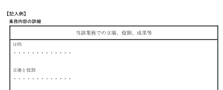 * 業務経歴の「詳細」欄に〇を付したものについて、業務内容の詳細(「目的」、「立場と役割」、「技術的内容及び課題」、「技術的成果」など)を、受験申込書に記入した「専門とする事項」を踏まえ、720字以内(図表は不可。半角文字も1字とする。)で、簡潔にわかりやすく整理して枠内に記入する。