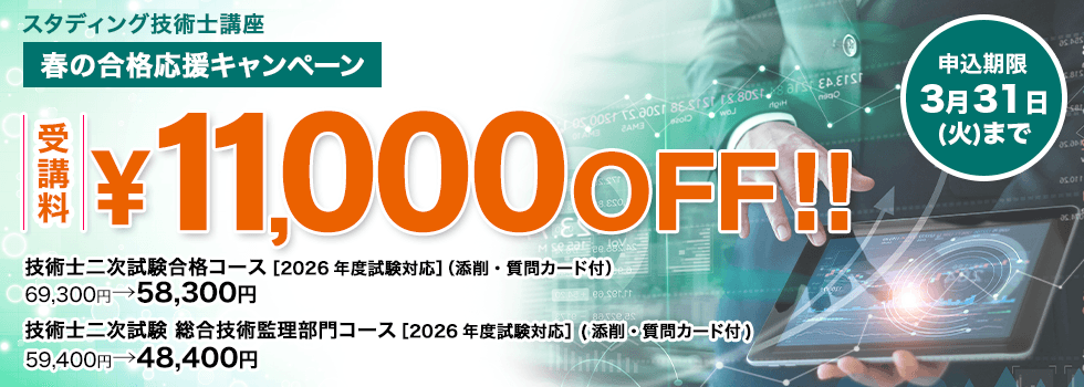 2026年度 再チャレンジされる方への再受講割引【2026年度更新版】技術士講座各コーススタディングの2025年度版以前の当該コースを購入済みの方は、お得な再受講者価格で2026年度版講座をご受講いただけます。詳細はこちら