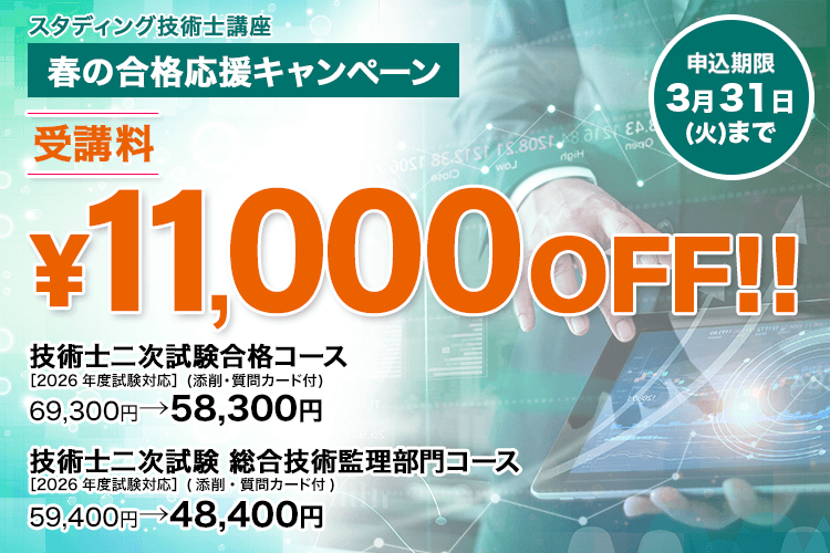 ![]() | 技術士 2026年3月31日(火)まで 技術士 2026年度 春の合格応援キャンペーン2026年度版の技術士二次試験対策の「添削・質問カード付」コースが11,000円OFF! |