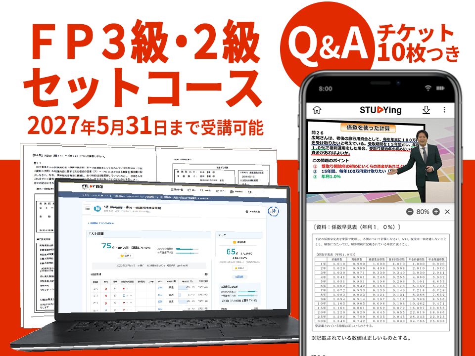 スタディング FP講座 Q&Aサービス 「Q&Aサービス」はスタディングの学習の中で生まれた疑問や不明点を講師に質問できるサービスです。Q&Aサービスの詳細についてはこちらをご覧ください。 「FP3級・2級セットコース」には、Q&Aサービスでご利用いただけるQ&Aチケットが10枚付属しています。 | ||||||||||||||||||||||||||||||||