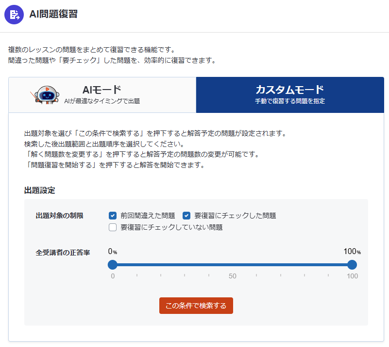 カスタムモードの画面に切り替わったら、条件を指定して問題復習を開始できます。
