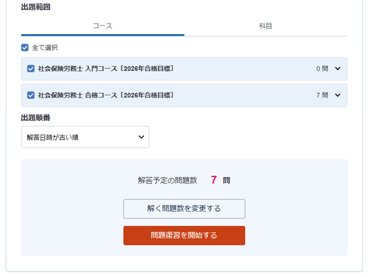 ※なお上記項目のチェックを全て外すことで、受講可能な全ての問題演習を対象にすることが可能です。