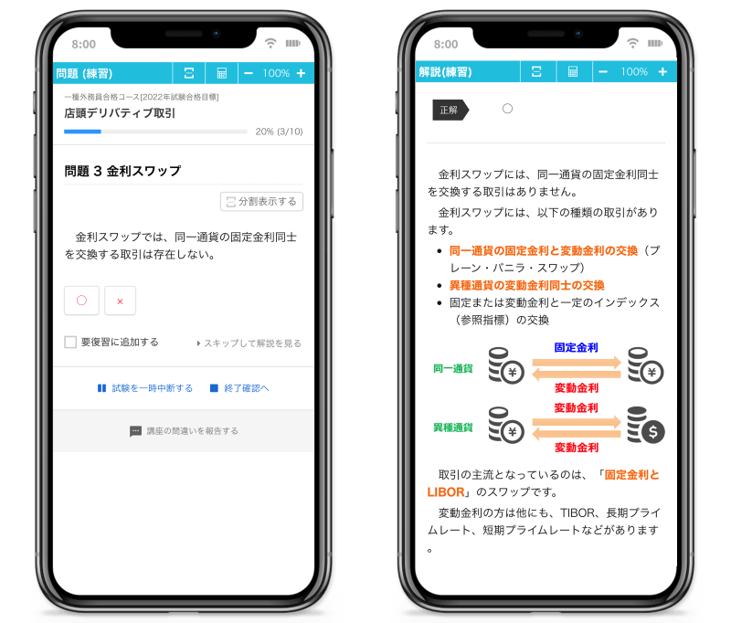 PC、スマホ、タブレットなど各種端末で問題練習ができます。 外務員試験は、本番の試験がPC試験ですので、本番同様のアウトプット練習が可能となります。 |