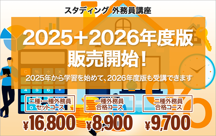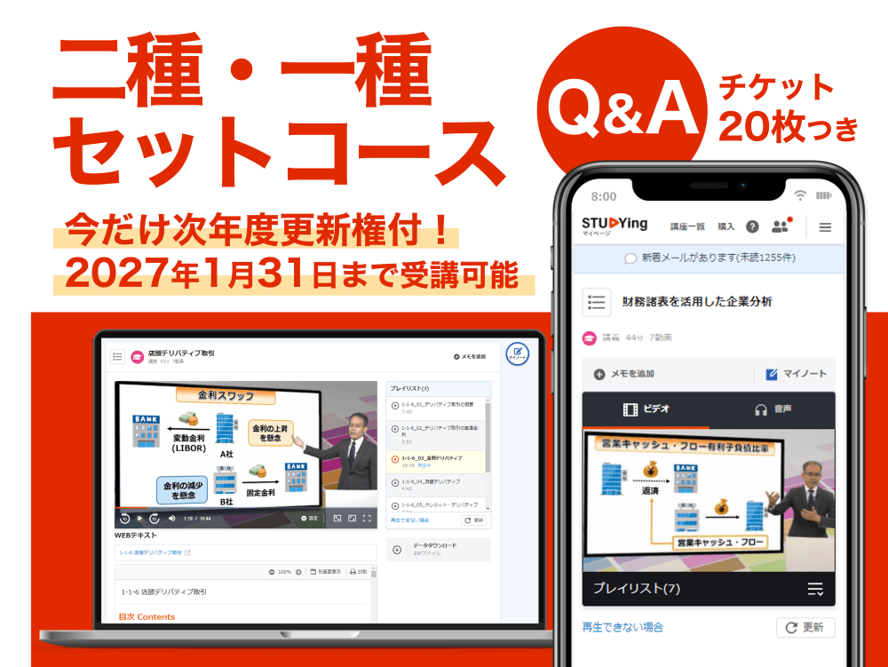 二種・一種の両方の範囲を学習される場合は、二種・一種外務員セットコース[2025+2026年試験合格目標]次年度更新権付をご利用ください。