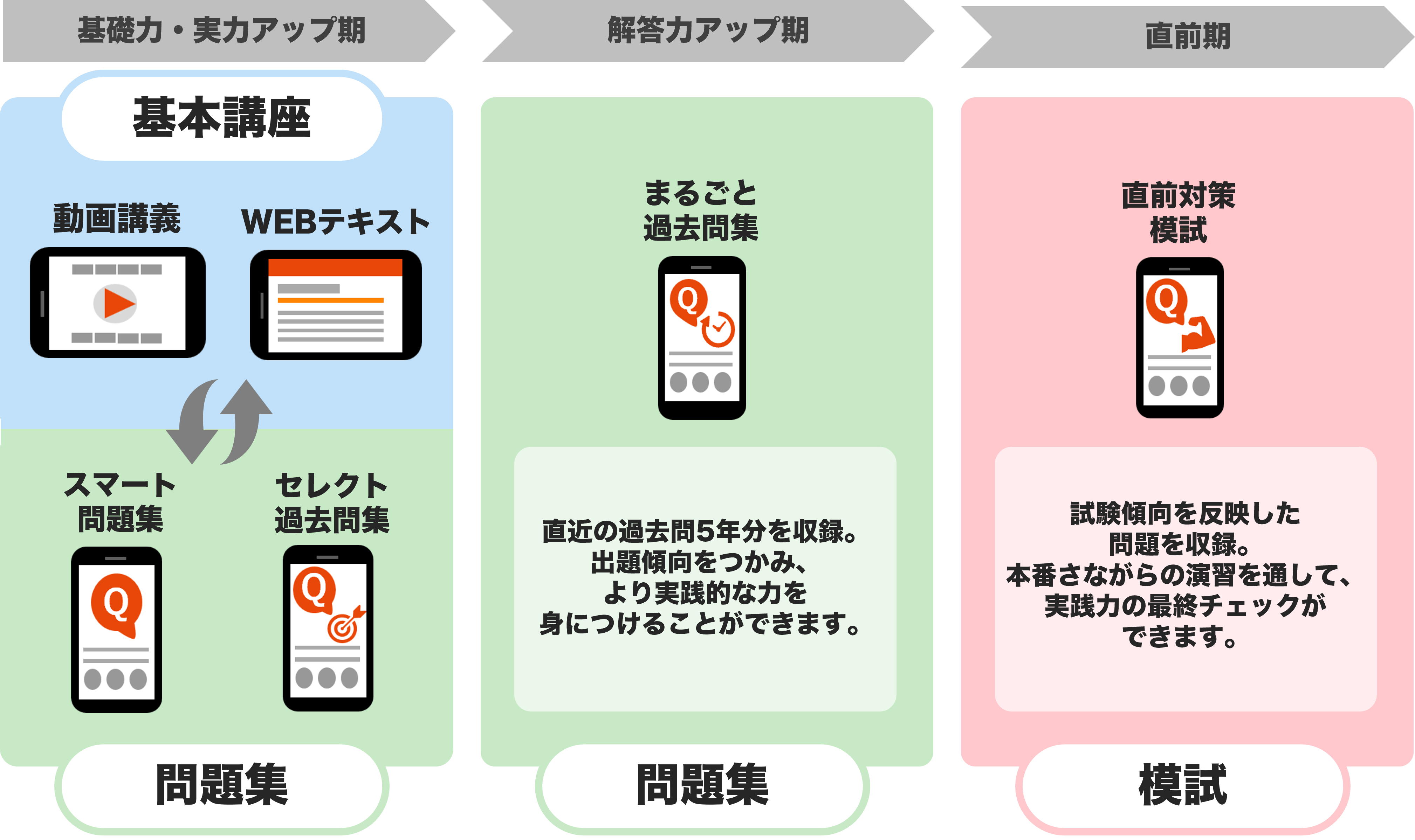 講師メッセージはこちらまずは動画講義とWEBテキストで、基本の知識をしっかりインプット。 その後は、各単元ごとに スマート問題集をチャレンジしながら、学んだ内容を振り返りつつ理解度をチェック。 さらに、頻出の過去問題を厳選した セレクト過去問集に取り組めば、試験の解き方のコツがつかめます。