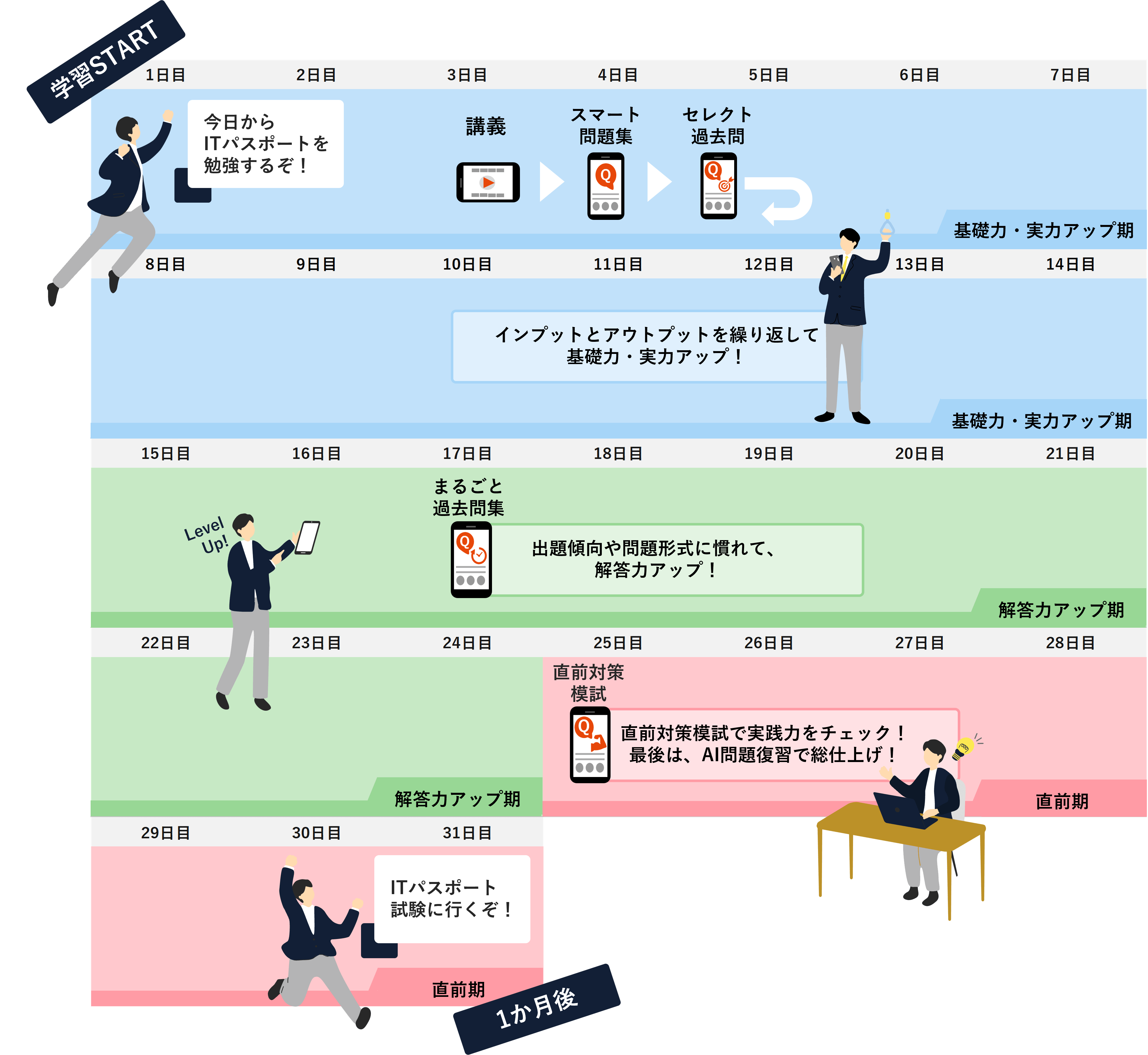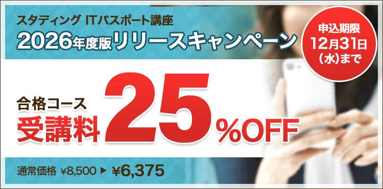 情報化が進み、日本の社会人全般に求められるITに関する知識やスキルは、年々高くなっています。スタディングでこれからの社会に活きるIT知識を効率的に学んでください!!本講座が皆様のITパスポート合格への近道として、活用いただけますと幸いです。