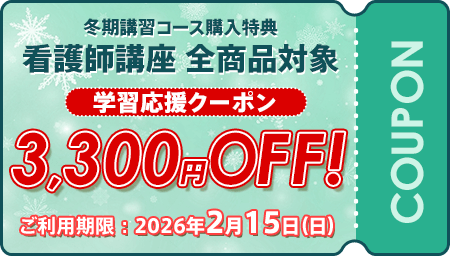 スタディングの冬期講習は、成人領域の科目横断的なトピックや、母性・小児・精神・老年・地域在宅の状況設定問題に対応した講義、ニガテ意識を持ちがちな計算問題への対応や頻出薬剤のまとめなど、国試でニガテ意識を持っている方の多い分野を厳選しています! 「状況設定問題や応用問題がわからない」という方や、「細かい部分を詰めてニガテをなくしたい」という方にもおすすめのコースです。 動画や問題を含むすべての教材がオンライン上で受講できるので、スマホやPCでどこでも学習が進められます。試験や課題で忙しい看護学生さんにぴったりです! さらにオンラインで講師に直接質問できるQ&Aサービスも付属。わからないところが出てきても、安心して学習できます。 本コースに含まれる講座の一部(動画講義、WEBテキスト、問題集)は、無料の初回講座※で今すぐお試し頂けます。 ※無料の初回講座には、「看護師国家試験合格コース[第115回/2026年2月合格目標]」の講座の内容も含まれておりますのでご注意ください。 |