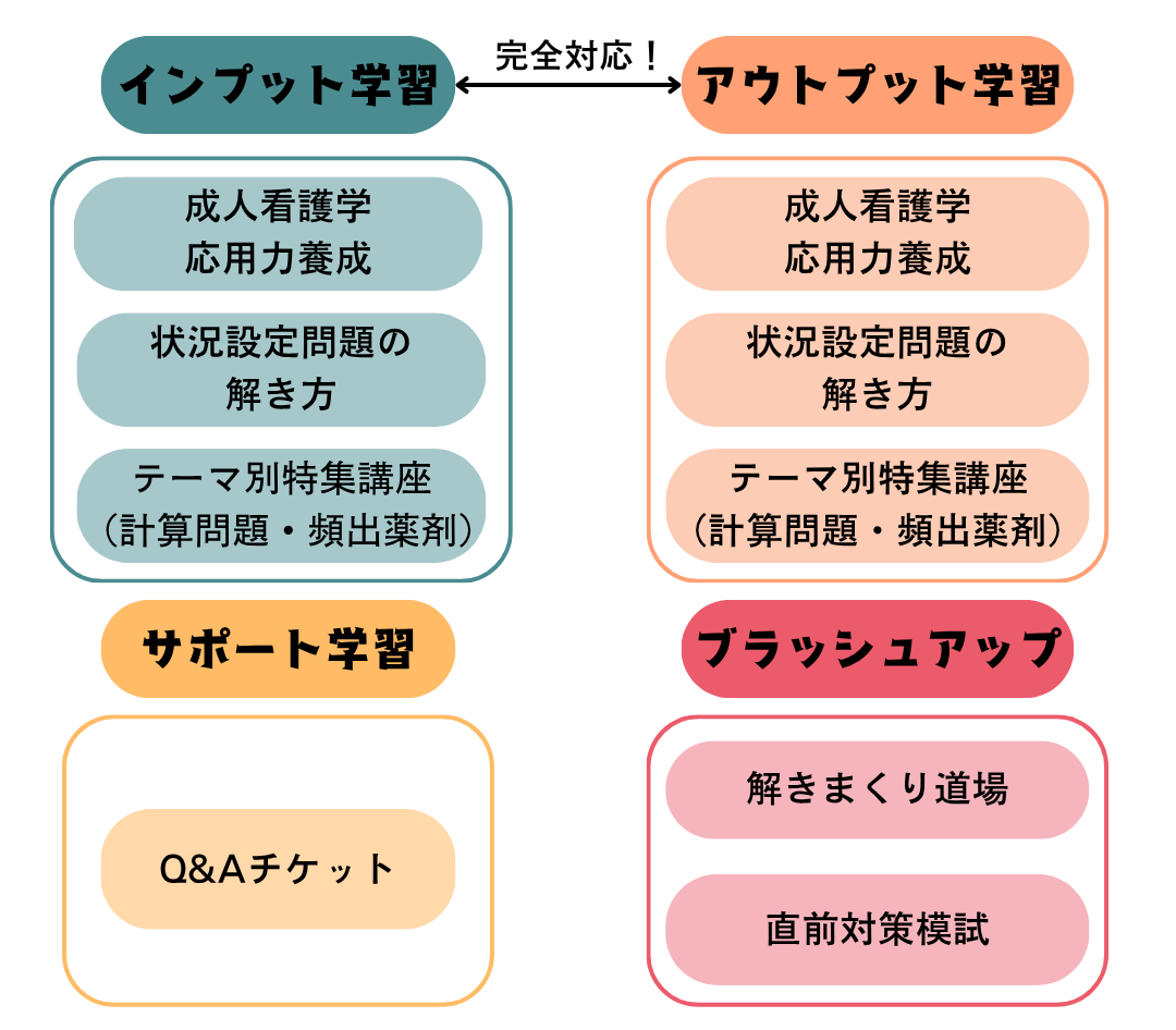 本コースは、国試前の総仕上げ・レベルアップやニガテの克服に最適な、応用的・科目横断的な内容を中心に構成したコースです。2025年12月からの期間限定で販売する講座で、短期間で学習が完了できるようにコンパクトに設計されています。 基礎からしっかり国試対策を始めたいという方には、「看護師国家試験合格コース[第115回/2026年2月合格目標]」(以下、「合格コース」)がおすすめです。 |