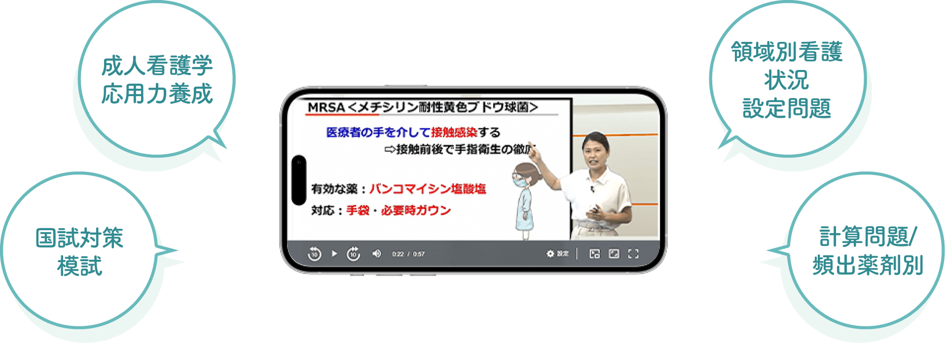 すべての講義・問題演習がスマホひとつで学べます!ちょっとしたスキマ時間に勉強ができるので忙しい看護学生と相性◎
