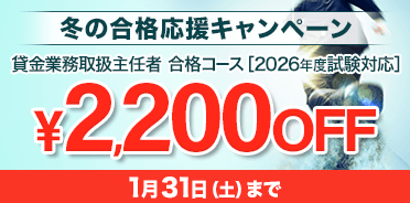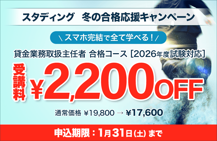 ![]() | 貸金業務取扱主任者 2026年1月31日(土)まで 貸金業務取扱主任者講座 2026年度 冬の合格応援キャンペーン期間限定「貸金業務取扱主任者 合格コース」 が¥2,200 OFF! |
