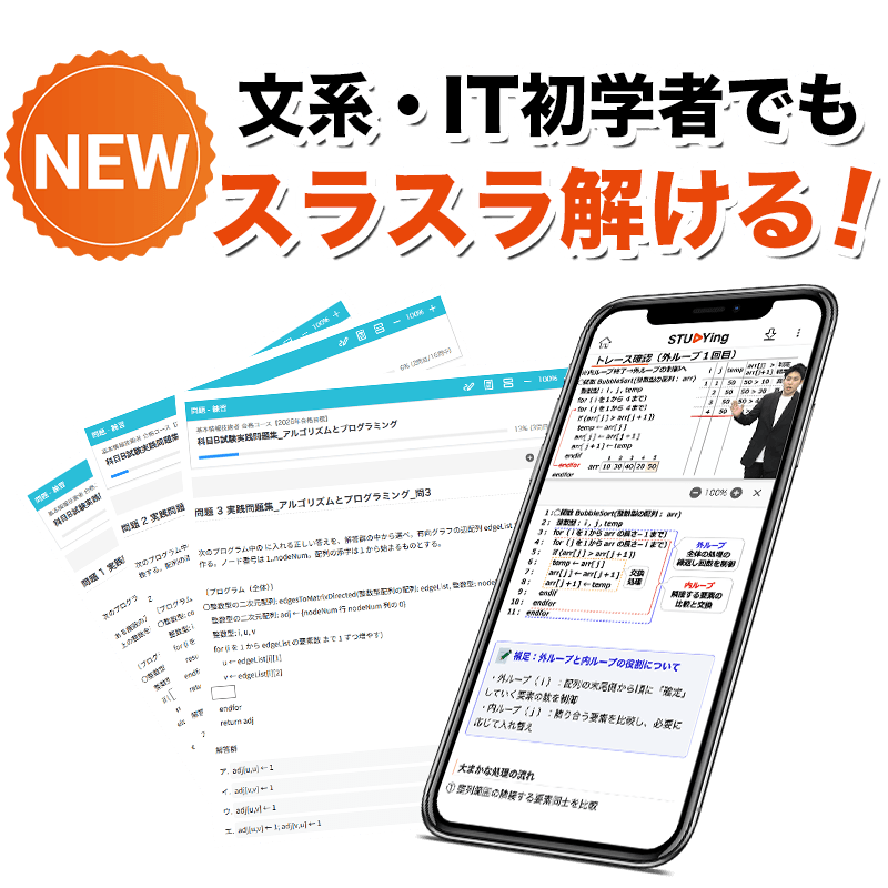 【科目A】IT初心者でも、効率的に合格を目指せる過去問を徹底分析し、合格に必要な知識を無駄なく習得できる合理的なカリキュラムを作成しました。 【科目B】非エンジニアでもスムーズに!科目Bの理解と得点力を段階的に習得科目Bは、基礎から応用まで段階的に学べる構成で、独学では得にくい合格力をしっかり身につけられます。・科目B基本講座:最重要テーマであるアルゴリズムを基礎から分かりやすく解説 ・科目Bトレース講座:処理の流れを一歩ずつ“見える化”して理解を深め、得点力へ直結 ・科目B解法講座:解答に必要なノウハウを動画で効率的に習得 基礎から応用、演習、実践問題まで一気通貫で学べるため、非エンジニアやIT初心者でも迷わずスムーズに学習を進められます。 |