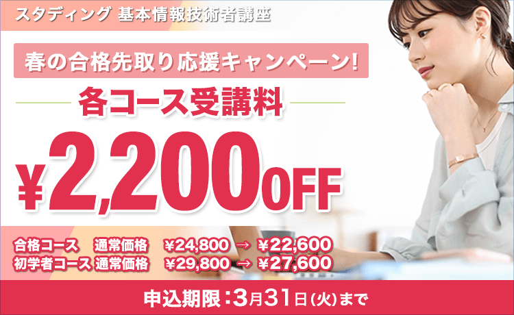 ![]() | 基本情報技術者 2026年3月31日(火)まで 基本情報技術者講座 春の合格先取り応援キャンペーン【2026年3月31日(火)まで】これから基本情報技術者試験合格を目指す方を応援!対象コースが2,200円OFF! |