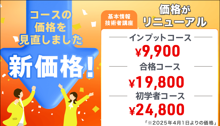 | 「インプットコース」 インプット学習に特化したコースです。問題演習は付いておらず、基礎知識のインプットだけスタディングを利用したい方向けのコースです。 「合格コース」 基本から過去問対策、科目B対策まで。合格に必要な教材が全て含まれたコースです。基本情報技術者の短期合格を目指す方に最適の基本コースです。学習Q&Aチケット5枚付きです。 「初学者コース」 「合格コース」に、「ITパスポートコース」がセットになった初学者向けコースです。基礎から確実に学ぶことができるため、IT初学者の方や、IT知識を基礎から固めたい方におすすめです。学習Q&Aチケット50枚付きです。 |