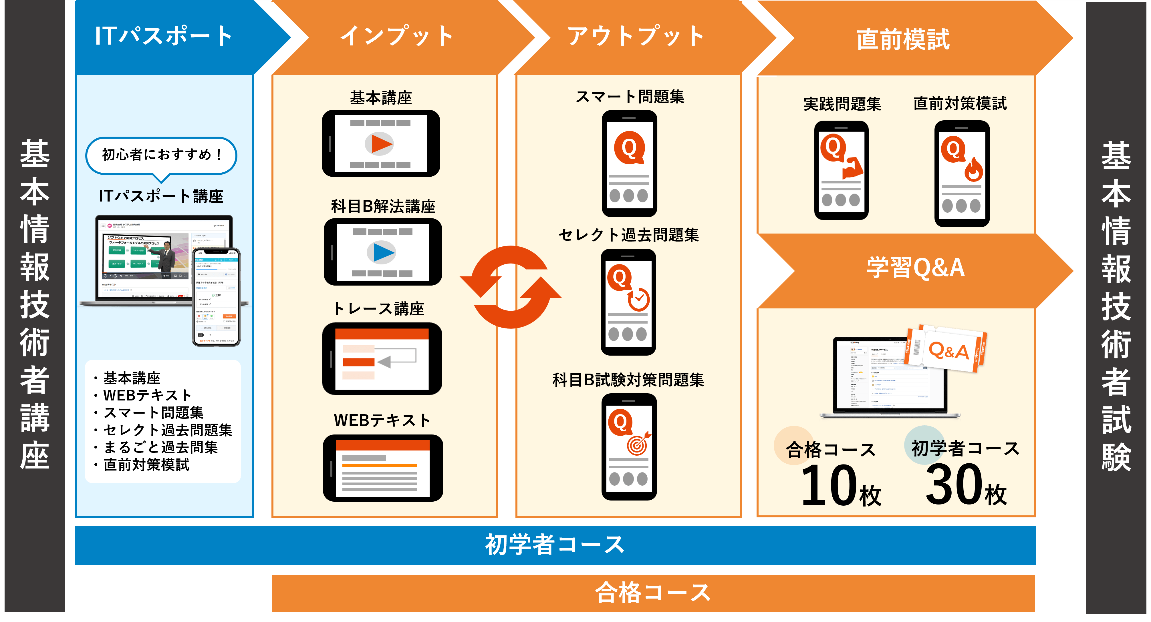 | 初学者コースは「基本情報技術者 合格コース」に「ITパスポートコース」がセットになったコースです。