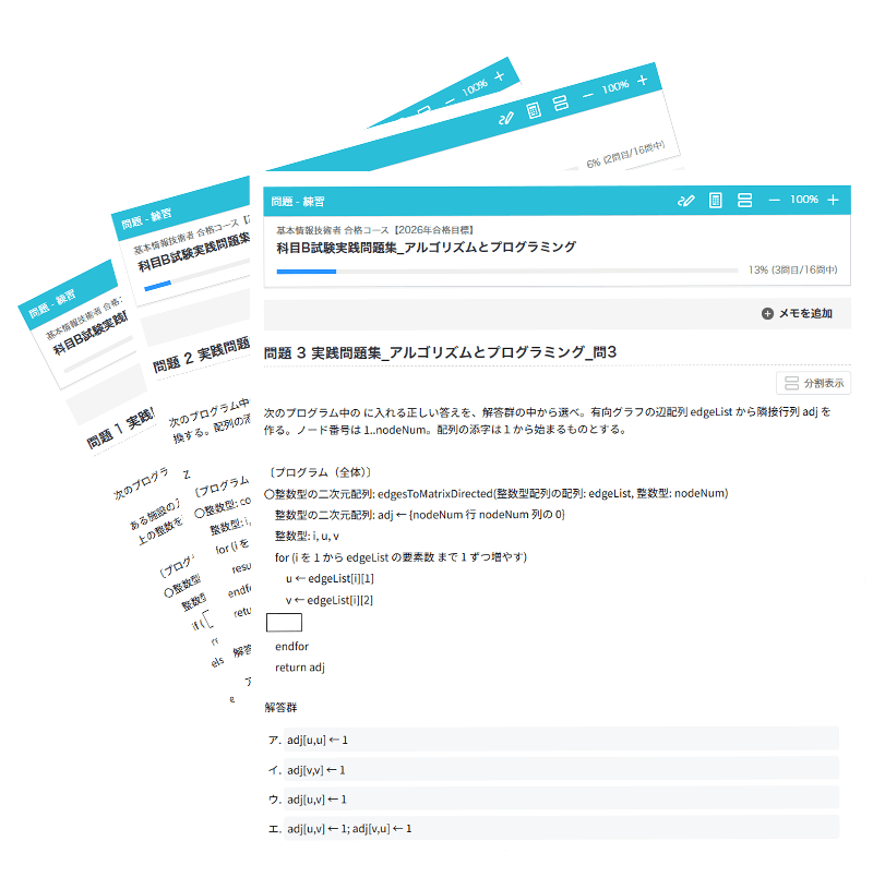 【科目A】IT初心者でも、効率的に合格を目指せる過去問を徹底分析し、合格に必要な知識を無駄なく習得できる合理的なカリキュラムを作成しました。 【科目B】非エンジニアでもスムーズに!科目Bの理解と得点力を段階的に習得科目Bは、基礎から応用まで段階的に学べる構成で、独学では得にくい合格力をしっかり身につけられます。・科目B基本講座:最重要テーマであるアルゴリズムを基礎から分かりやすく解説 ・科目Bトレース講座:処理の流れを一歩ずつ“見える化”して理解を深め、得点力へ直結 ・科目B解法講座:解答に必要なノウハウを動画で効率的に習得 基礎から応用、演習、実践問題まで一気通貫で学べるため、非エンジニアやIT初心者でも迷わずスムーズに学習を進められます。 |