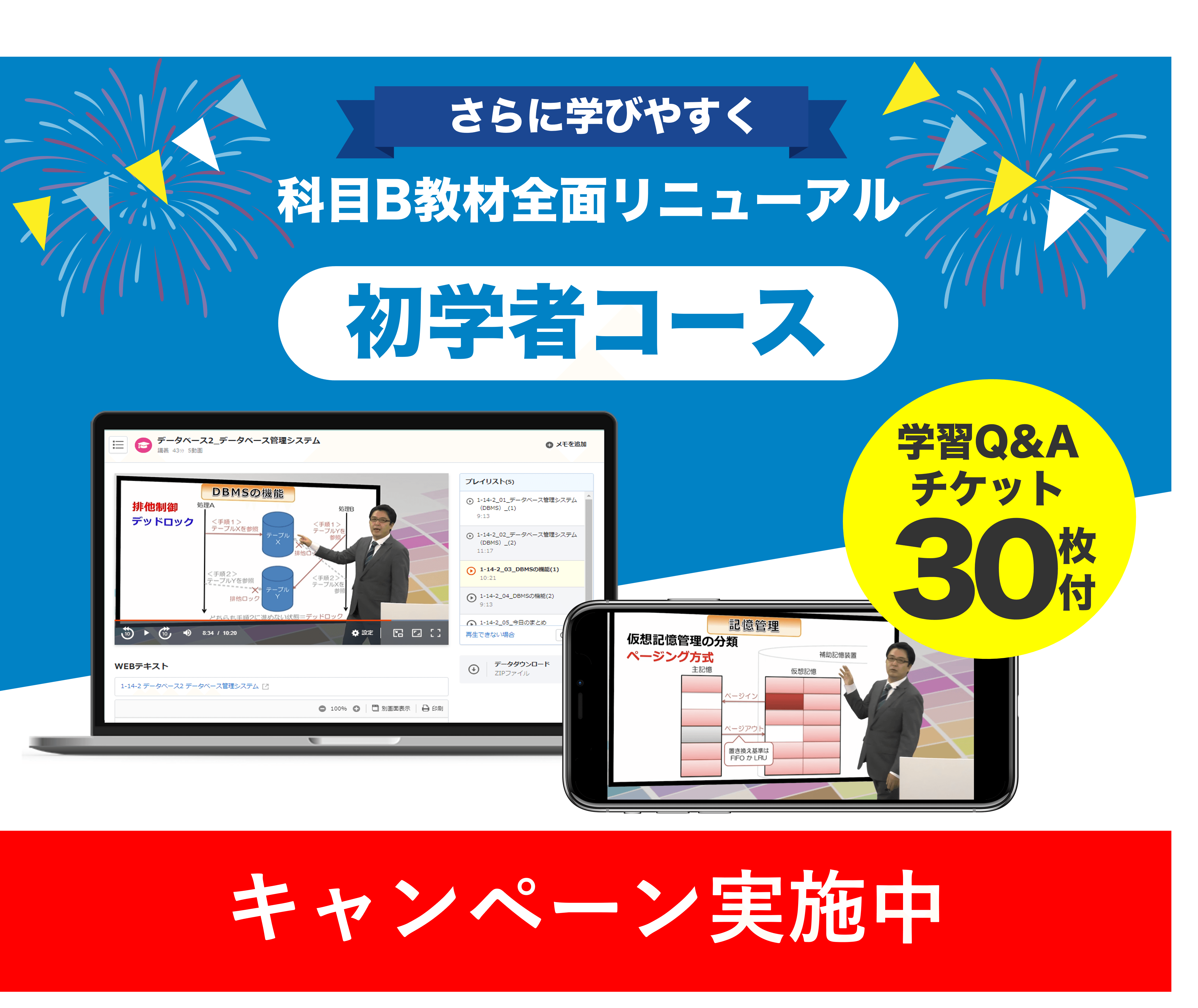 | 「合格コース」 科目Aから科目B対策まで。合格に必要な教材が全て含まれたコースです。無駄なく効率的に、基本情報技術者の合格を目指したい方に最適です。学習Q&Aチケット10枚付きです。 「初学者コース」 「合格コース」に、「ITパスポートコース」がセットになった初学者向けコースです。基礎から確実に学ぶことができるため、IT初学者の方や、IT知識を基礎から固めたい方におすすめです。学習Q&Aチケット30枚付きです。 |