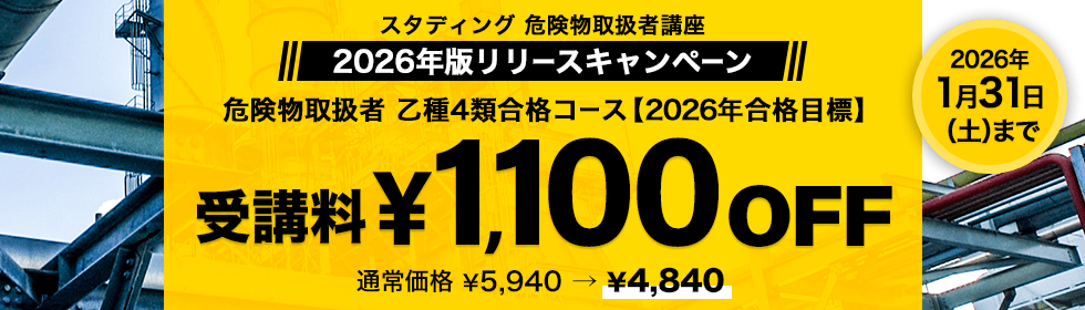 1/31(土)まで | 危険物取扱者試験 乙種4類の合格に必要な知識をコンパクトに凝縮したコースです。初めて学ぶ方でも、よく出るところを中心に無駄を省いて効率よく学ぶことができます。学習Q&Aチケット3枚付!詳細はこちら |
