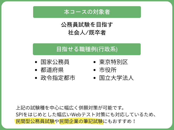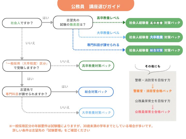 高卒レベルの公務員試験を目指す社会人/既卒者 【大卒教養対策パック】 教養試験のみ課される大卒レベルの公務員試験を目指す社会人/既卒者 【総合対策パック】 専門科目まで課される大卒レベルの公務員試験を目指す社会人/既卒者 |