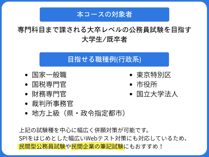 | 本コースの対象者 | 専門科目まで課される大卒レベルの公務員試験を目指す大学生/既卒者 |