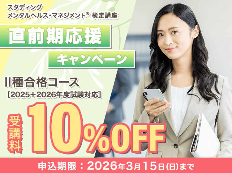 ![]() | メンタルヘルス・マネジメント®検定 2026年3月15日(日)まで メンタルヘルス・マネジメント®検定講座 直前期応援キャンペーンメンタルヘルス・マネジメント®検定Ⅱ種(ラインケアコース)合格コースが期間限定10%OFF! |
