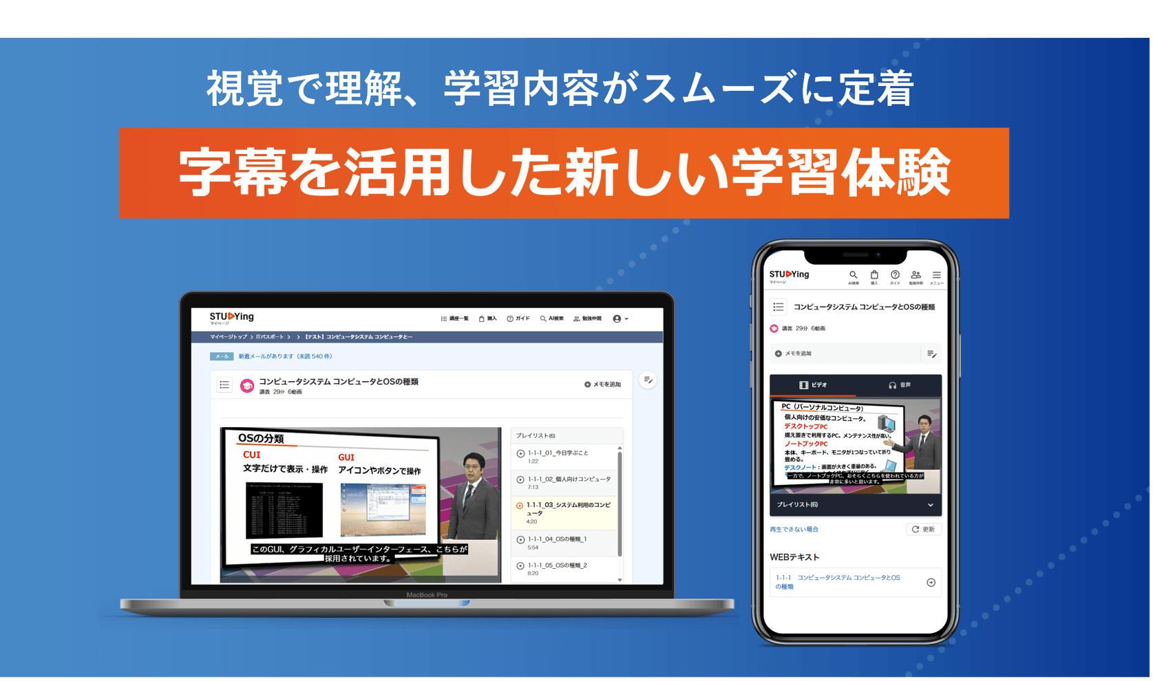 ITパスポート試験では、IT専門用語が多く、アルファベット表記のつづりはわかっても、正しい読み方がわからず間違った読み方で覚えてしまうことや、単語を丸暗記してしまうことで知識が定着しにくいという受講生の声がありました。この課題を解決するため、AI字幕を導入しました。音声を聞きながら字幕で確認することで、目で表記を理解しつつ、耳で正しい読みを習得できます。その結果、丸暗記に頼らず自然に知識が定着し、効率よく試験対策を進められるようになります。また、字幕を活用することで講師の説明を視覚的に把握でき、学習内容が効率よく記憶に残り、理解もしやすくなります。