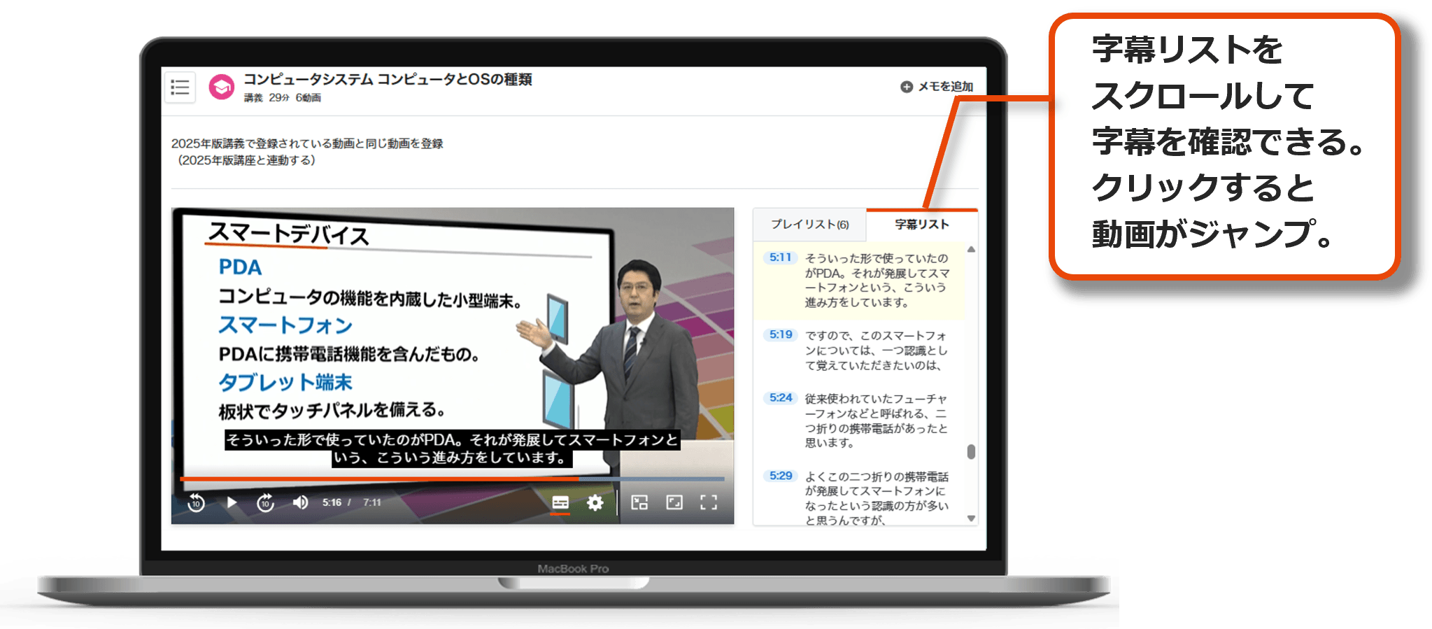 音声を再生できない環境でもスキマ時間を活用して動画講義を視聴できるだけでなく、従来の字幕機能を超えた効率的な学習体験を実現します。学習ページにリスト化された字幕テキストをクリックするだけで、該当部分をすぐに再生できるため、動画講義を用いたピンポイントでの復習も可能になりました。