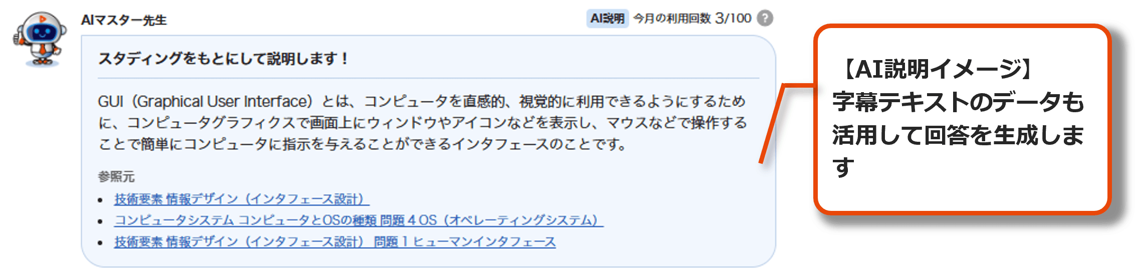 「AI説明」は、スタディング内の学習コンテンツを基に、生成AIが学習に関する質問に回答する機能です。これまではWEBテキストや問題集といった教材が主なデータソースでしたが、字幕が実装されたことで、動画講義の内容も回答生成時の学習データとして活用されるようになりました。これにより、受講生が質問した際、より正確で的確な回答を提供できるようになります。