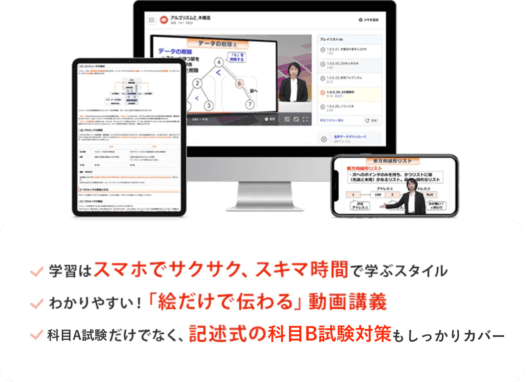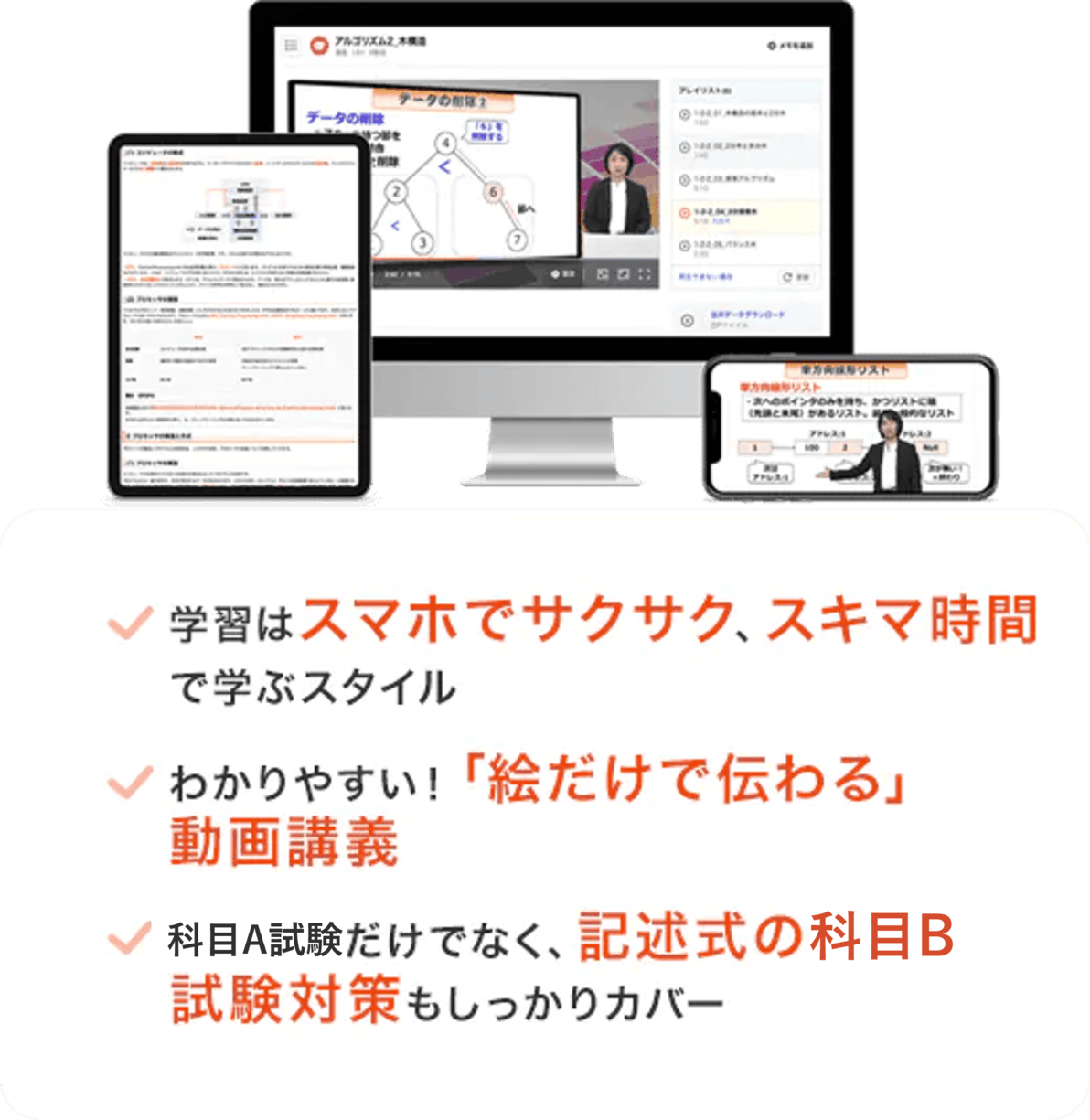 そこで、スタディング 応用情報技術者講座は、初めて勉強をする方でも「これならできそうだ」と思ってもらえるように、ビジュアル重視で「絵だけで伝わる」ことをコンセプトに据えて、とっつきやすく、でも試験によく出る頻出事項はしっかり押さえることを最重要事項にした講座にしました。