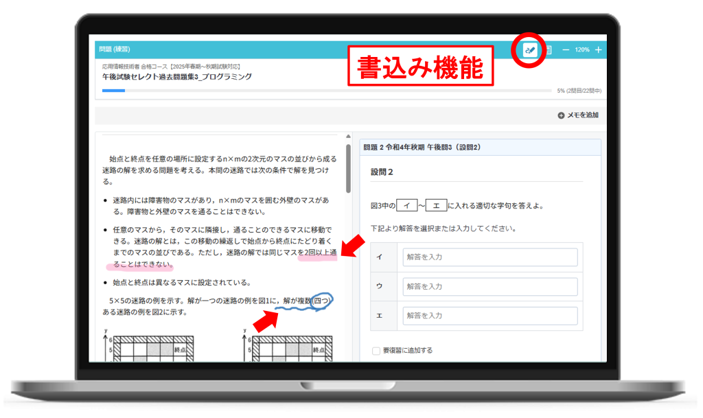 さらに問題を解きながら画面上にマーカーを引ける「書込み機能」などが搭載されているため、パソコン上で問題を解く練習ができます。