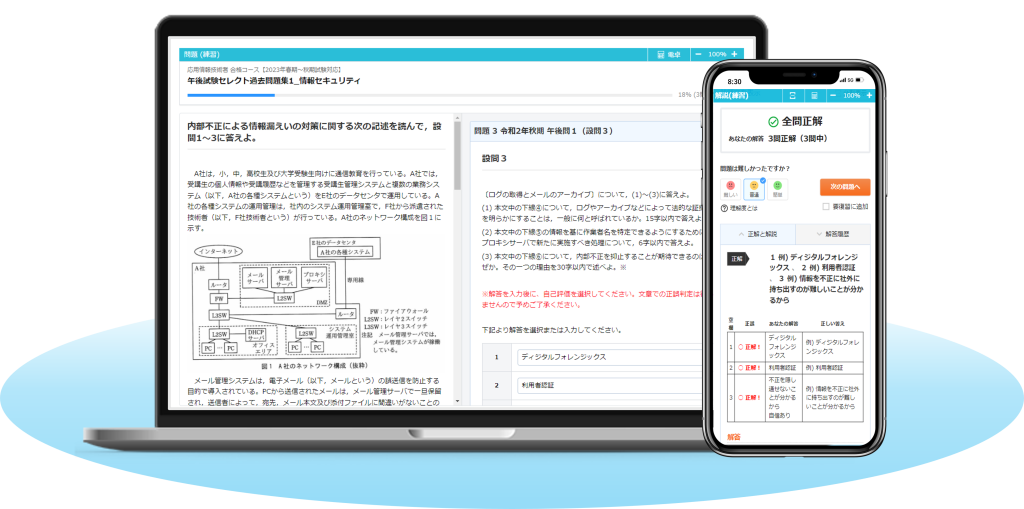 スタディング応用情報技術者講座では、動画講義から問題演習まで、スマホやパソコンで完結できます。特にパソコンでの演習は、実際の試験環境に近い形で練習できるため、CBT方式への対策としても効果的です。