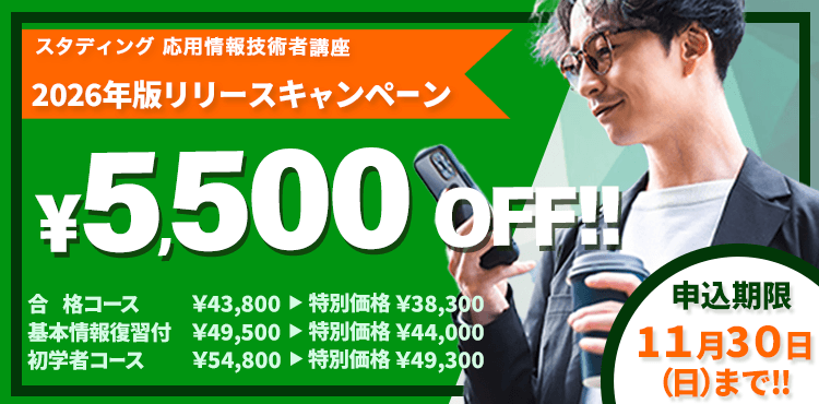 ![]() | 【2026年合格目標】の各コースの受講期限は2026年11月30日※です。 ※教育訓練給付商品をご購入の方は商品ご購入から13か月です。 なお今後、試験実施団体のIPA(情報処理推進機構)より試験日の発表がございましたら、受講期限の延長を行う可能性がございます。 |