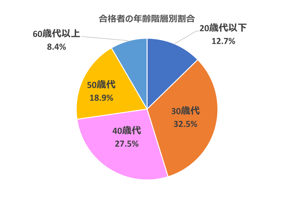 令和7年度(2025年度)合格者の年齢別割合は以下のとおりです。合格者の最年少者は19歳、最高齢者は78歳でした。