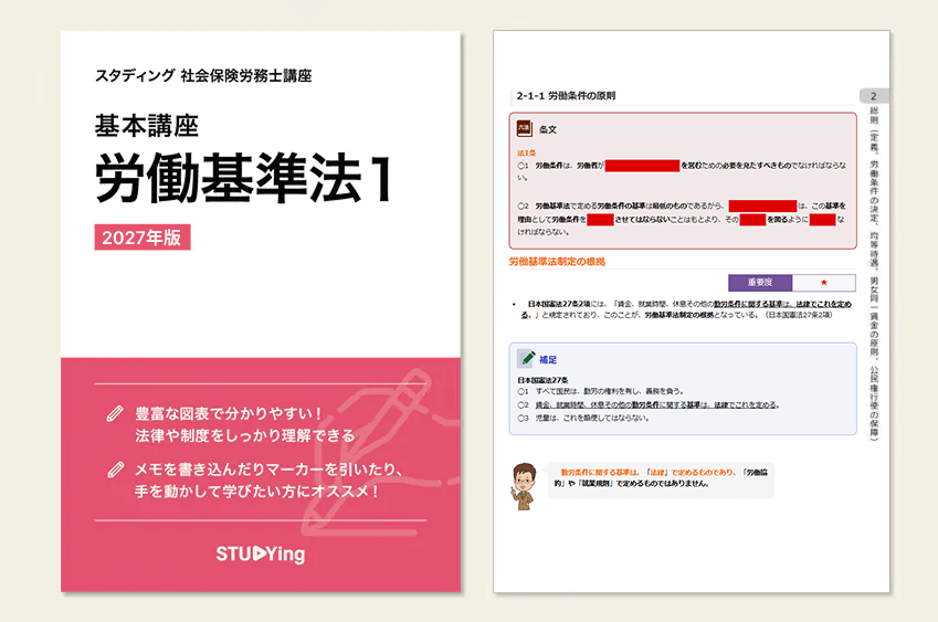 | 冊子版単独の購入はできません。スタディング 社会保険労務士講座をご購入いただいた方のみ冊子版を購入いただけます。なお、既にスタディング 社会保険労務士講座をご購入済の方は冊子版だけを追加でご購入いただけます。 |