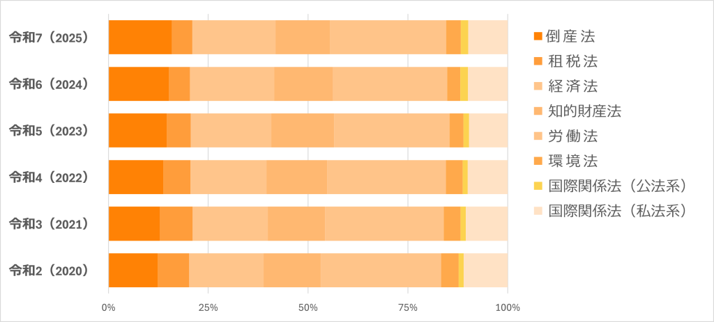 最も多く選択されているのは労働法で、過去5年間変わらずほぼ3割となっています。