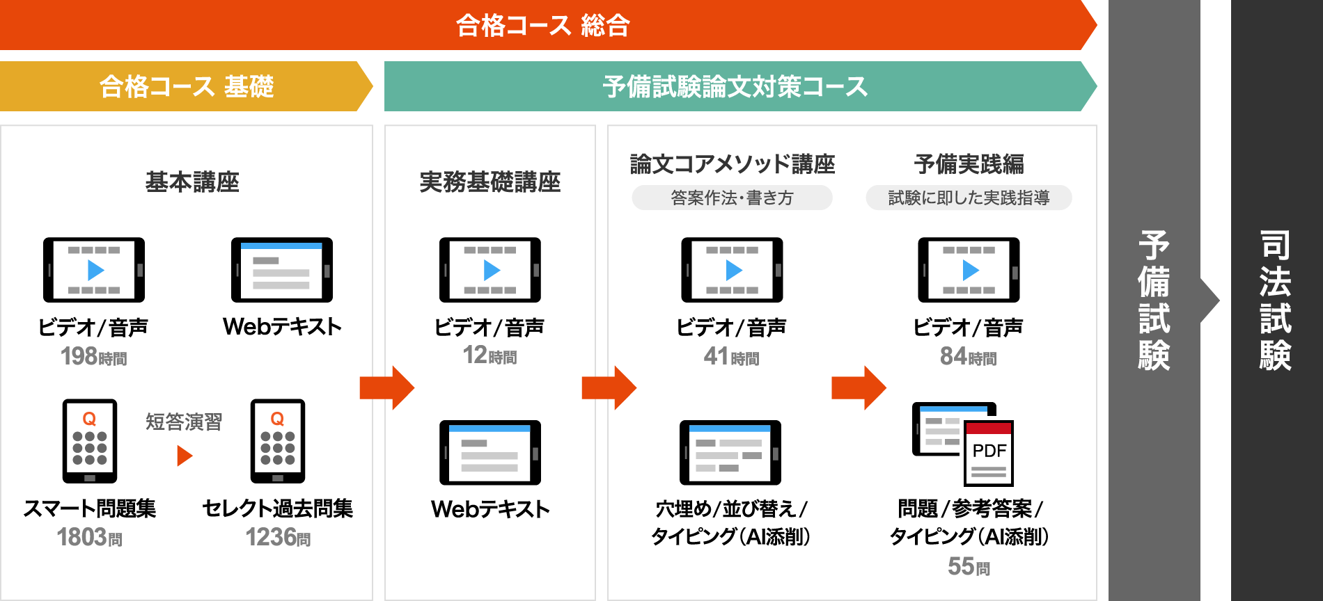 ※論文対策講座・予備試験実践編が含まれるのは、総合コースと予備試験論文対策コースのみとなります。基礎コースには含まれません。