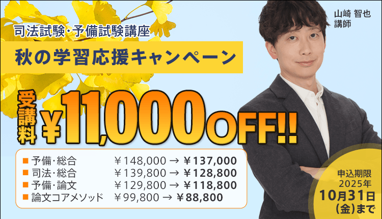 ![]() | 司法試験・予備試験 2025年10月31日(金)まで 予備試験・司法試験 秋の学習応援キャンペーン司法試験、予備試験の合格コース(総合)、論文対策コース、論文コアメソッド講座の受講料が10/31(金)まで11,000円OFF! |