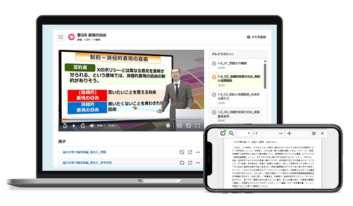 まず、「基礎講座」では、法律基本科目(憲法、行政法、民法、商法、民事訴訟法、刑法、刑事訴訟法)を基礎からしっかり身につけることができます。短答演習の「スマート問題集」も「セレクト過去問」も基本7科目すべてについております。 また、「論文対策講座(論文コアメソッド講座)」では、論文式試験対策に不可欠な「書き方」を穴埋め問題、並べ替え問題、タイピング(AI添削)と段階的に学習頂けます。問題文の読み方や、答案バランスや具体的な論述方法等、過去問と答案例を使って、実践的なノウハウを具体的に解説いたします。そして、「論文対策講座(予備試験実践編)」では予備試験にフォーカスした答案作成のノウハウ、スキルを実践的に指導します。さらに、AI添削機能を活用することで、自分の答案を客観的かつ効率的にブラッシュアップすることが可能です。
